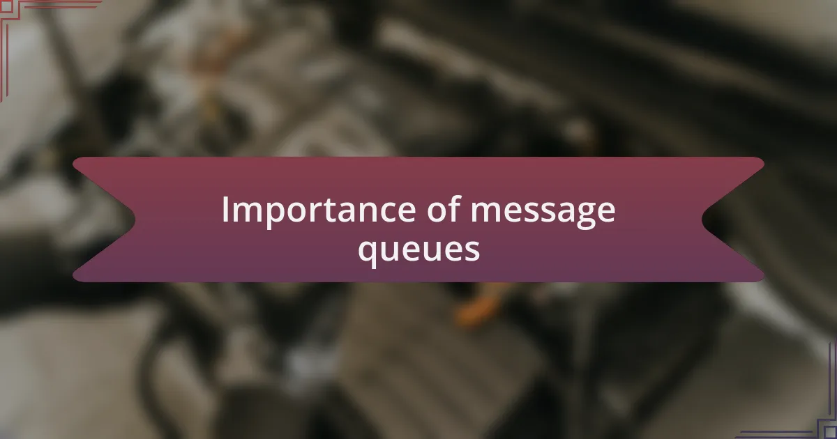 The importance of message queues in software development cannot be overstated. I’ve often found that they serve as the backbone of distributed systems, ensuring that components can function independently and still communicate effectively. When I worked on a microservices project, we opted for a message queue to handle inter-service communication, and it felt like the glue binding everything together, allowing each service to evolve without breaking the whole system.